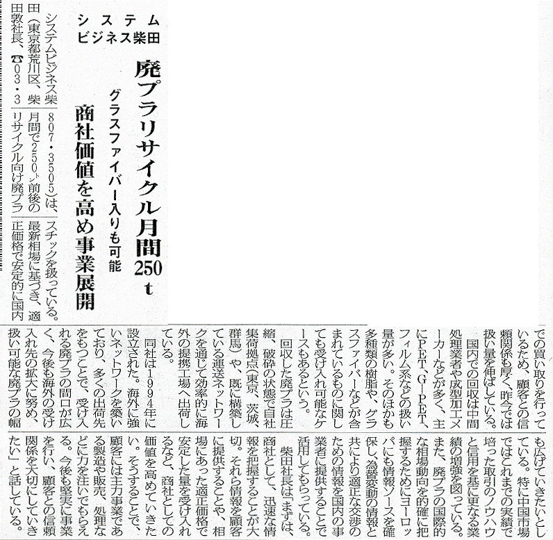 System Business Shibata Co., Ltd. (Tokyo / Arakawa-ku, President Atsushi Shibata, Phone. +81-3-.3807-3505) has been dealing approximately 250t per month of recycle (abolished) plastics for new recycling process.