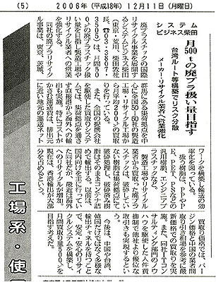 ▼An article about our company appeared in the Recycling Economy Times on 11th DEC 2006.